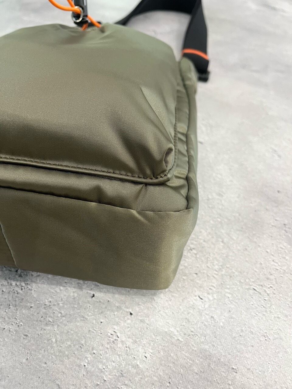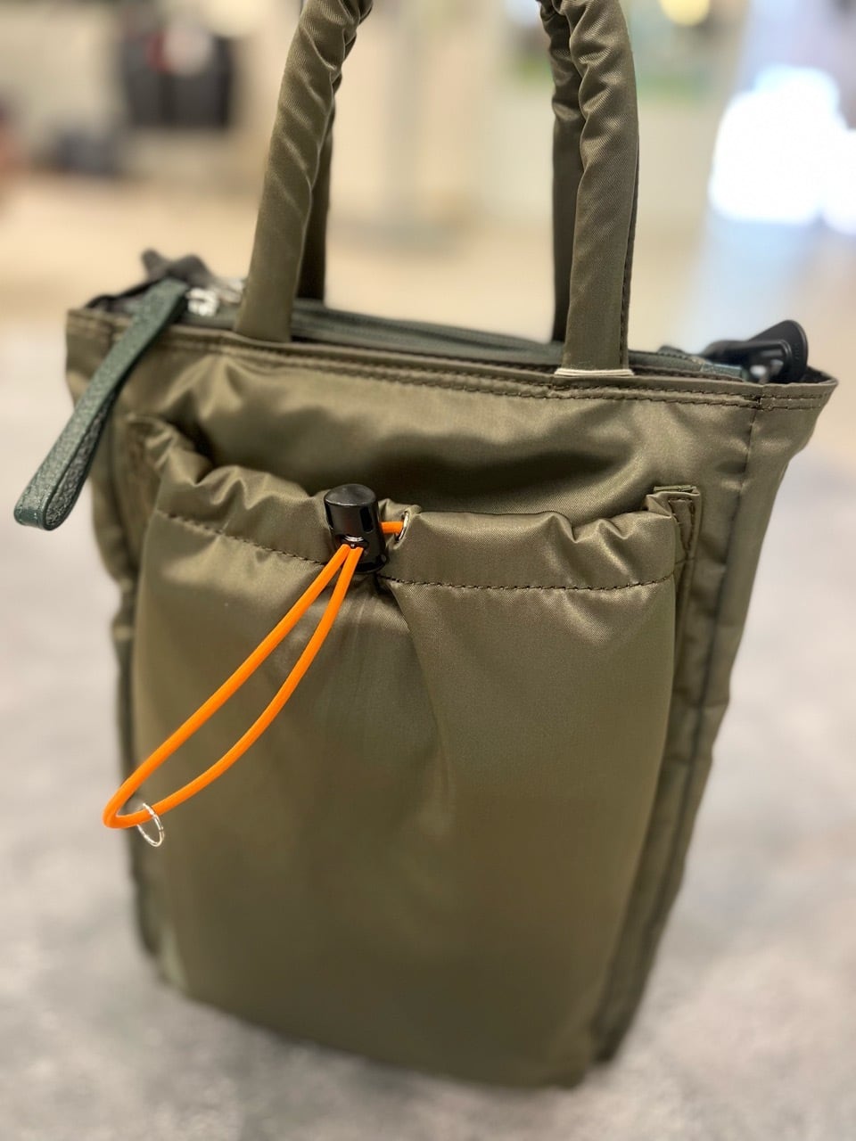 光沢のあるきめ細かいカーキナイロンに、オレンジのループとグリーンのレザージップ引き手を効かせた、バランスの良いおしゃれなカラーリングが魅力。