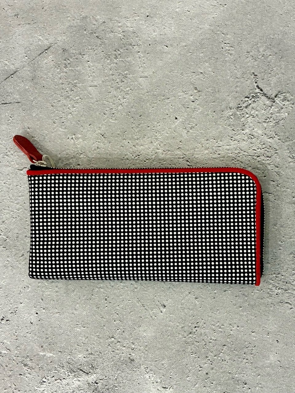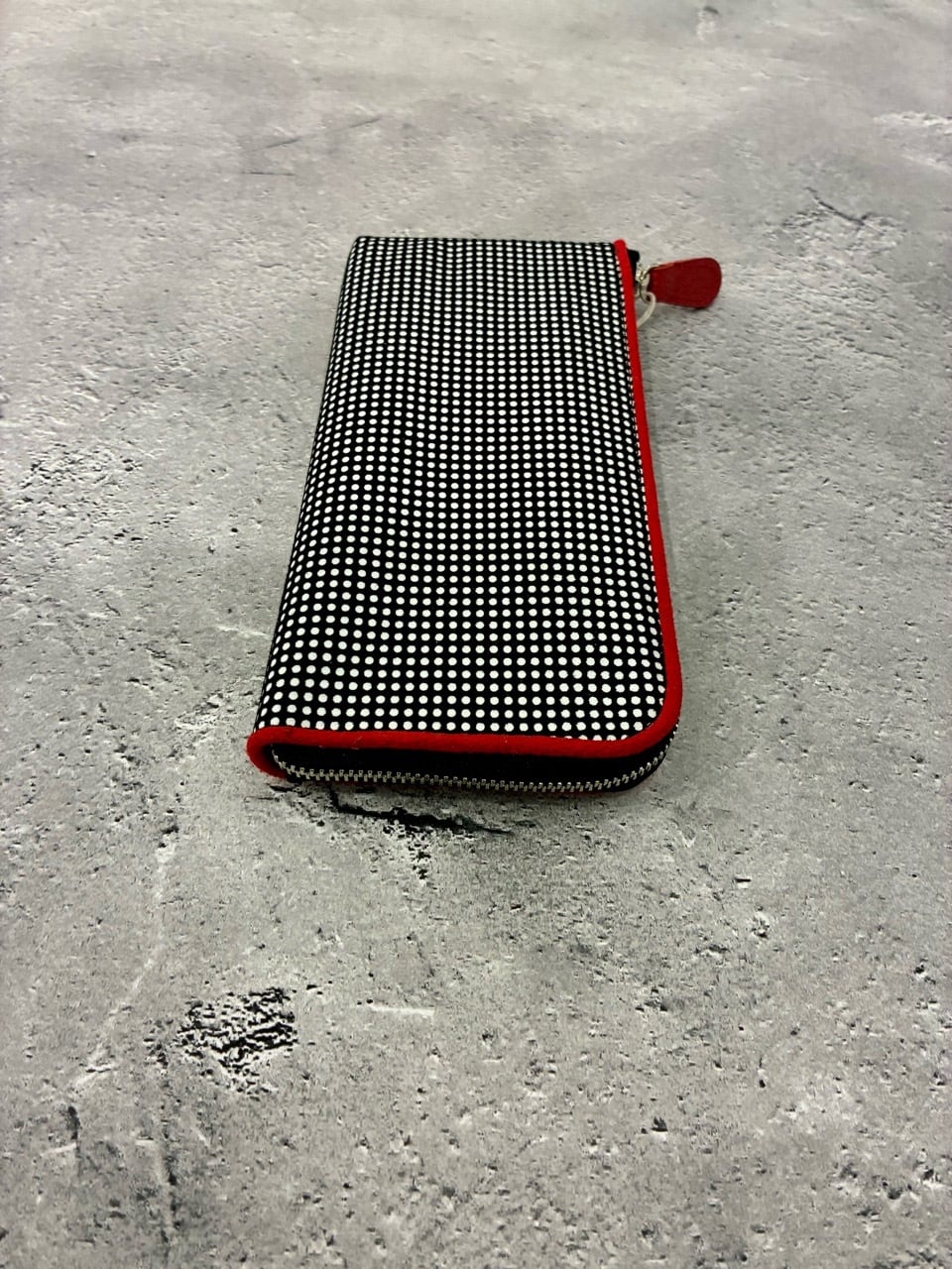 モノトーンのマイクロドットに赤のレザーパイピングが映え、ドゥミルらしい洗練と遊び心が感じられます。