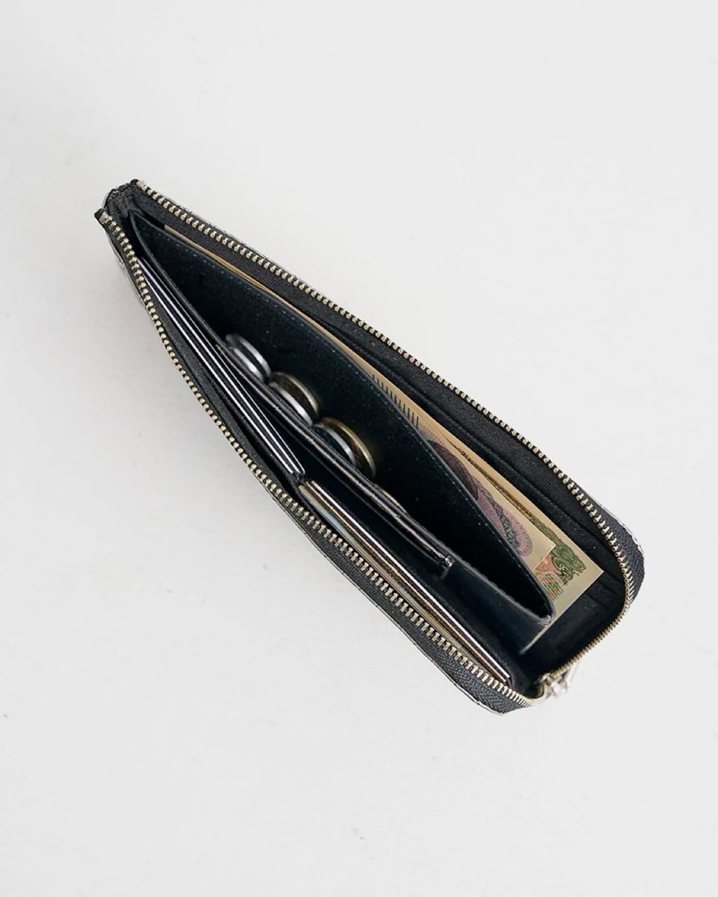 ファスナーを一度開けるだけで、コイン・お札・カードをひと目で見渡せる設計。