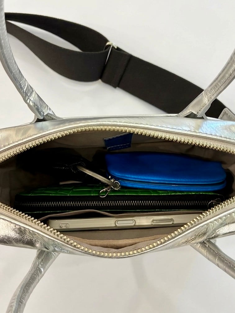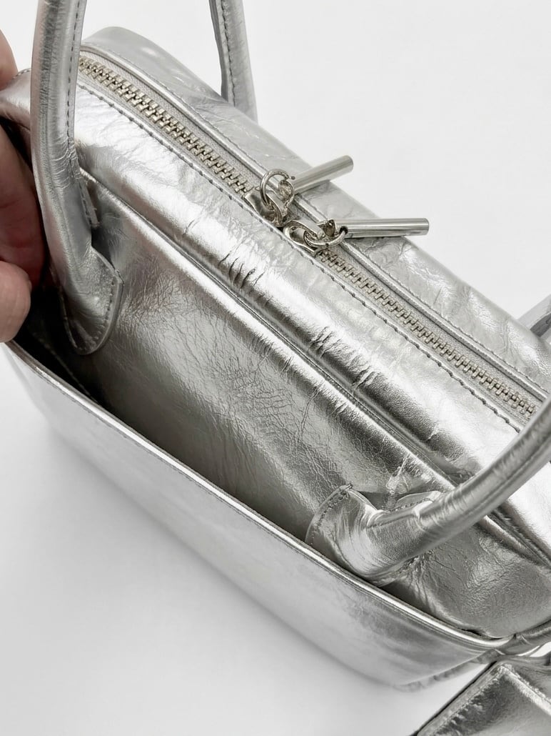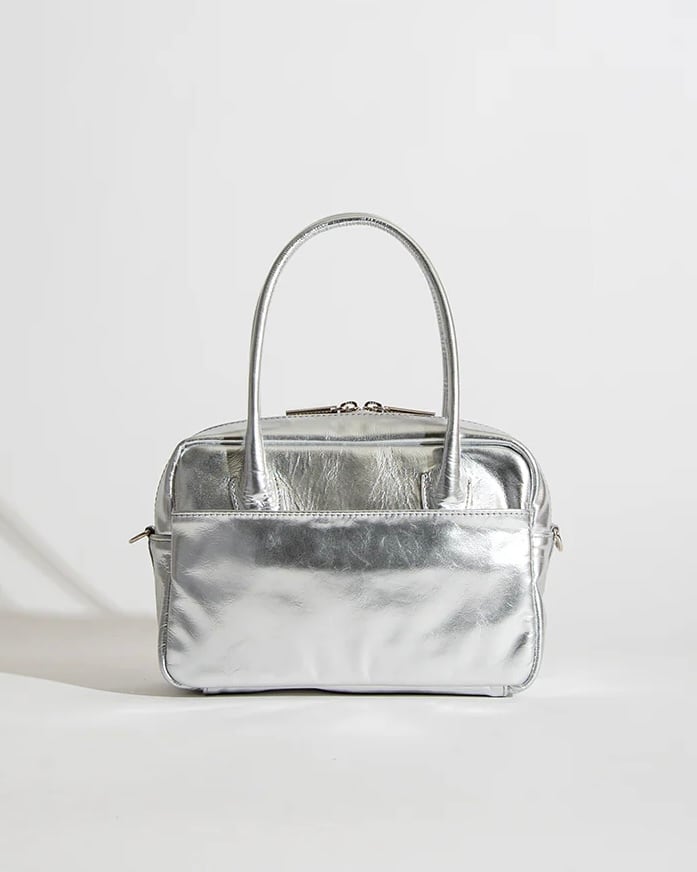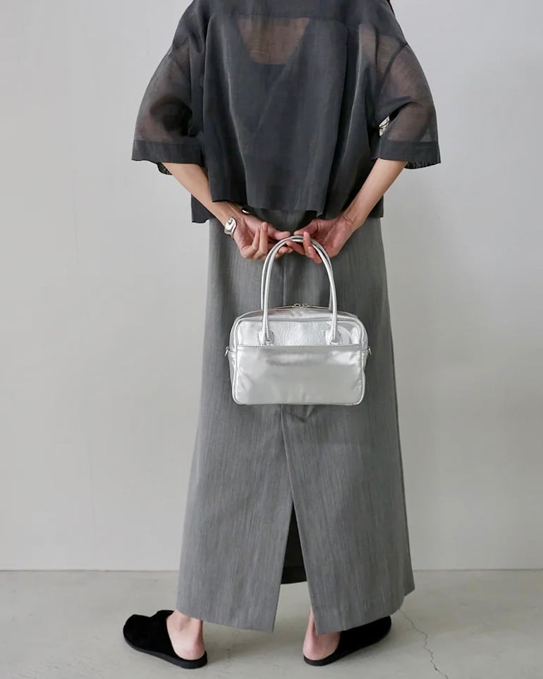 クリーンなシルバーレザーが印象的な、ボストンバッグ。