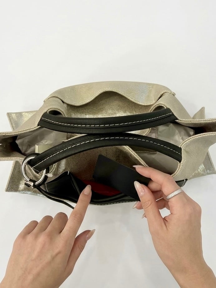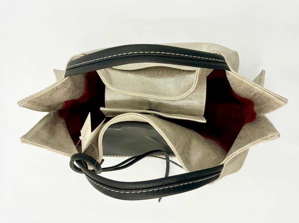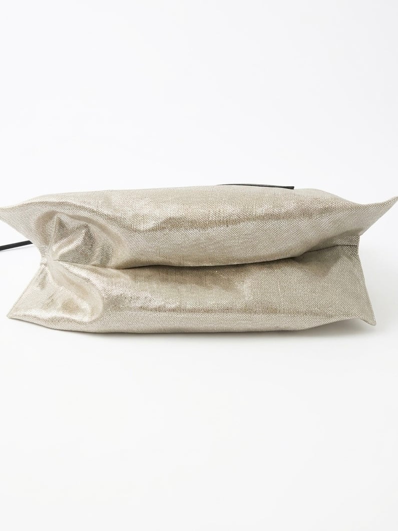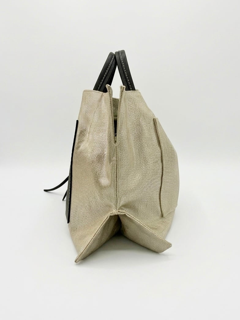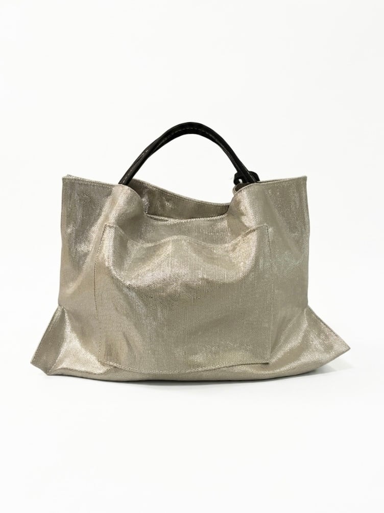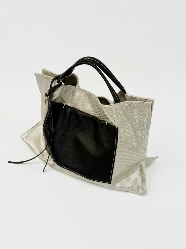 麻に箔加工を施した生地と、柔らかく上質なレザーハンドルの組み合わせ。