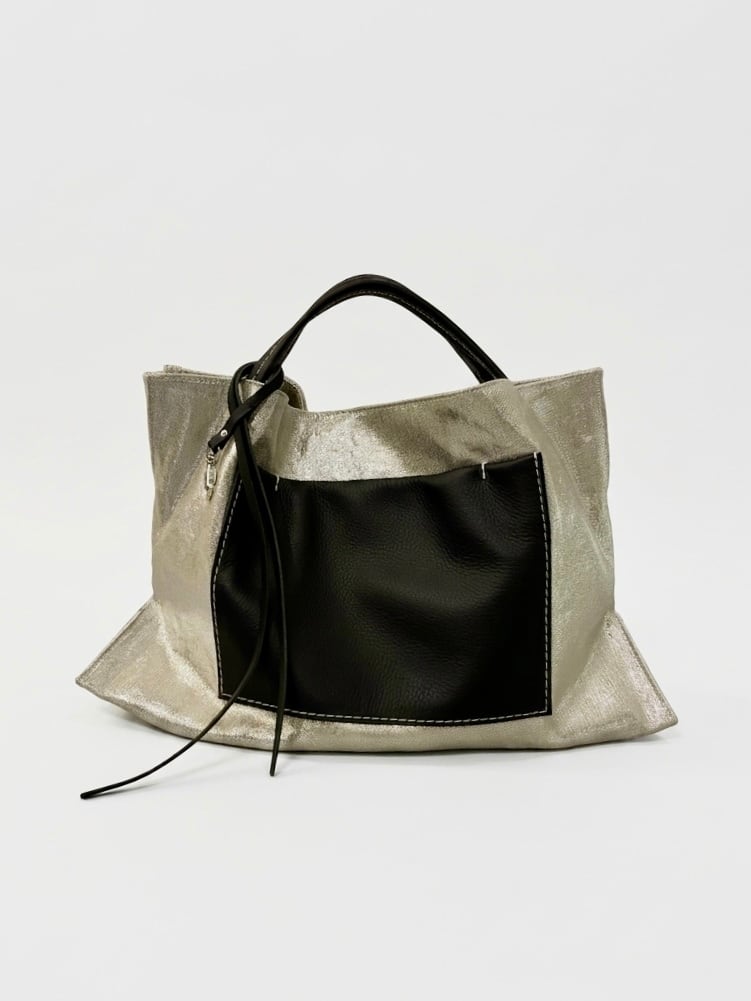 持ち手とポケットにブラックのレザーを配することで、
