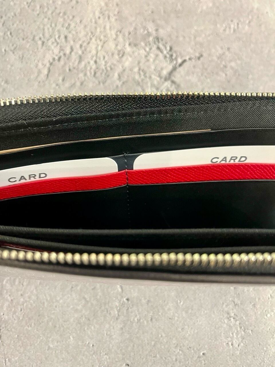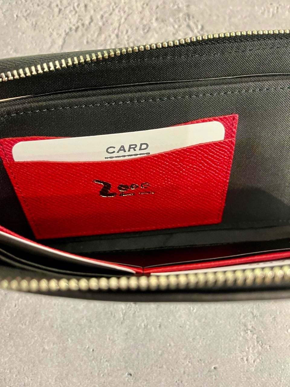 一度の開閉でお札、コイン、カードと全て取り出せる便利なL字型の長財布。
